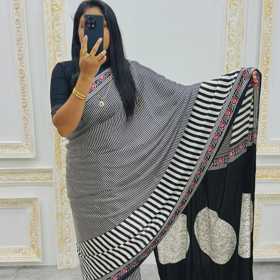 Minimalist Ajrakh Modal Silk Saree – Black & Ivory Tones