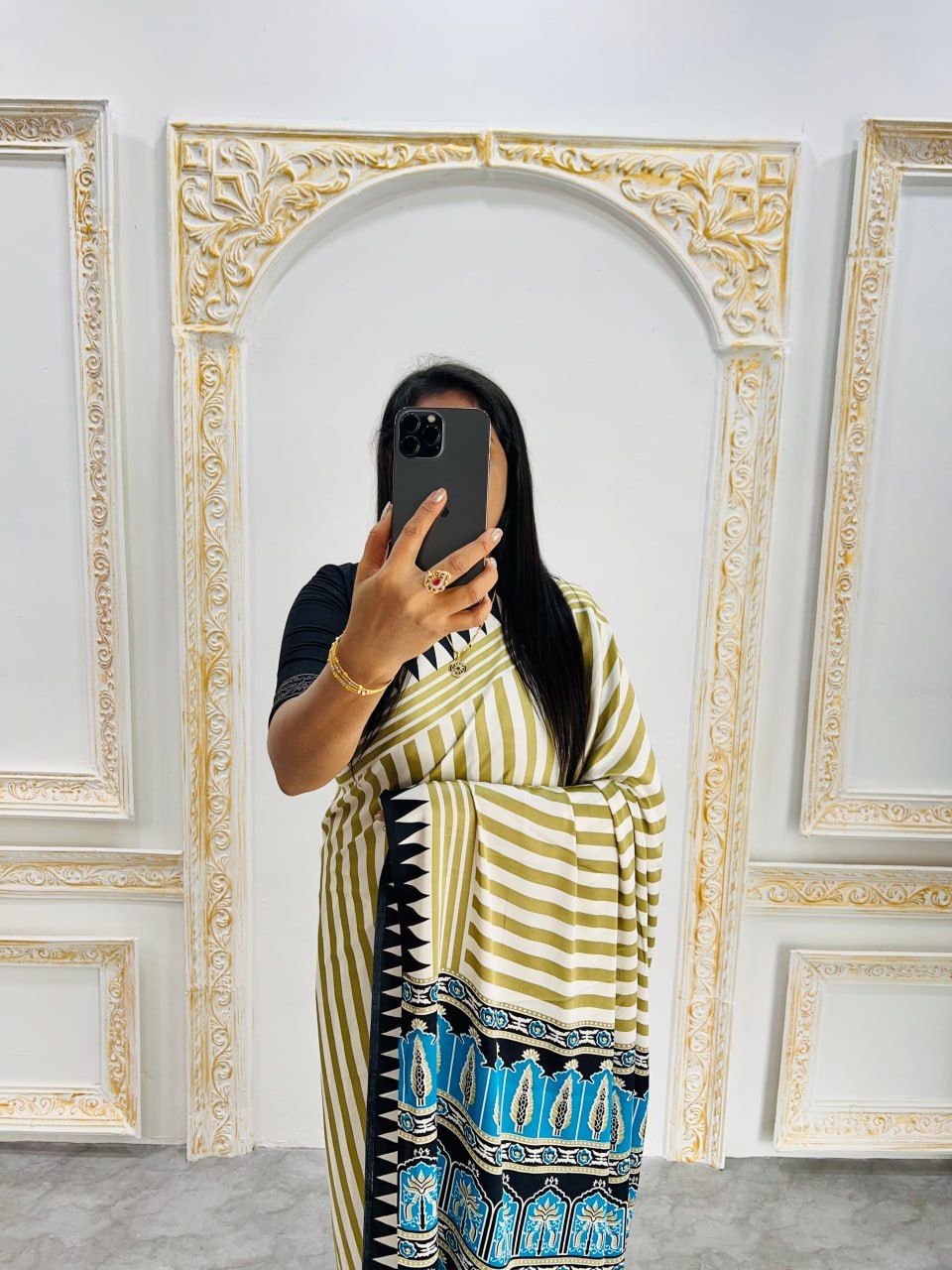 Cream & Teal Stylish Ajrakh Design Saree with Striped Pallu – Trendy Look