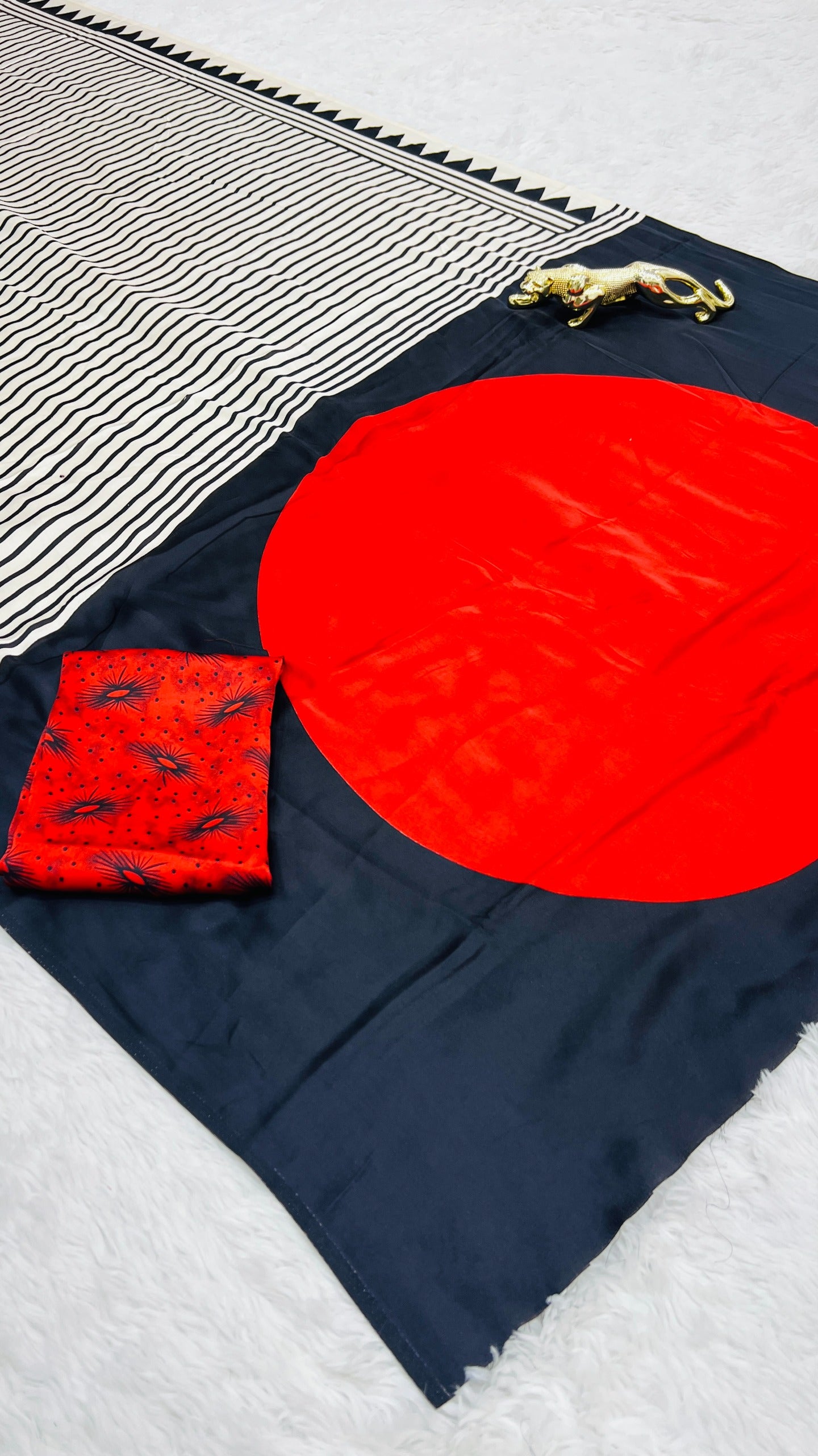 Discover the timeless elegance of traditional Ajrakh craftsmanship with this striking designer saree. Featuring bold black and white stripes complemented by vibrant red accents, this piece seamlessly blends classic artistry with contemporary style. Hand-printed using the ancient Ajrakh technique, each saree showcases intricate patterns and authentic dyeing methods passed down through generations. The sophisticated color palette makes it versatile for both festive occasions and refined everyday wear. Perfect for those who appreciate heritage textiles and distinctive design, this saree celebrates India's rich textile legacy while offering modern aesthetic appeal.