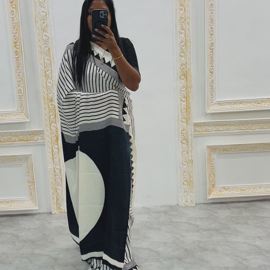 This sophisticated black and white abstract print saree merges timeless elegance with contemporary design sensibilities. The monochromatic palette creates a versatile foundation that pairs effortlessly with varied accessories and styling choices. Sharp, artistic patterns across the fabric showcase modern craftsmanship while maintaining the grace of traditional draping. Ideal for the fashion-forward individual who values understated luxury and clean aesthetics, this saree works equally well for professional settings, cultural events, or elevated casual occasions. A refined investment piece that transcends seasonal trends and complements diverse personal styles.